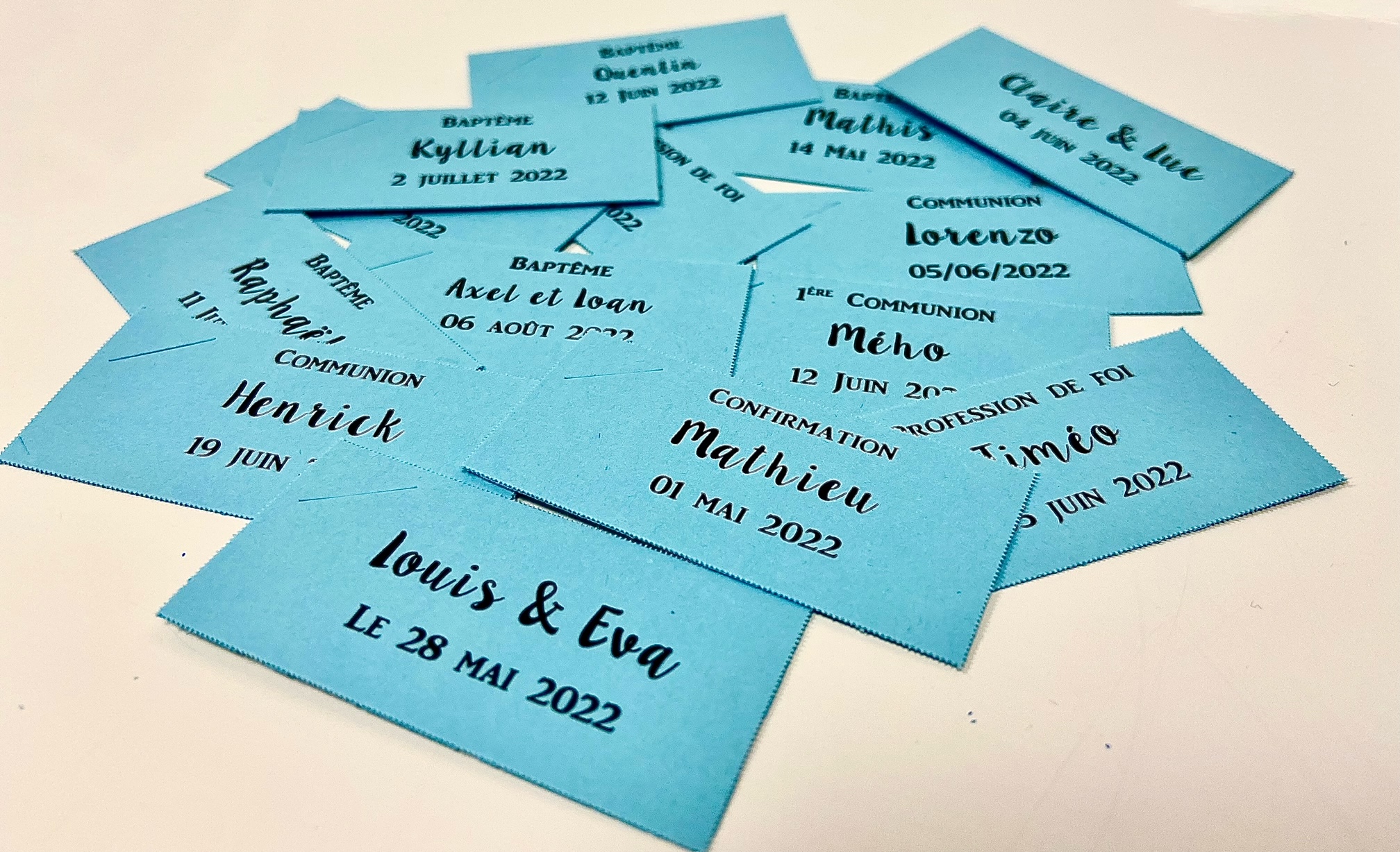 Etiquette bleu ciel en forme de rectangle. Cette jolie étiquette personnalisée, dispose d’une fente pour y passer un ruban, afin de pouvoir la fixer à votre contenant à dragées.
