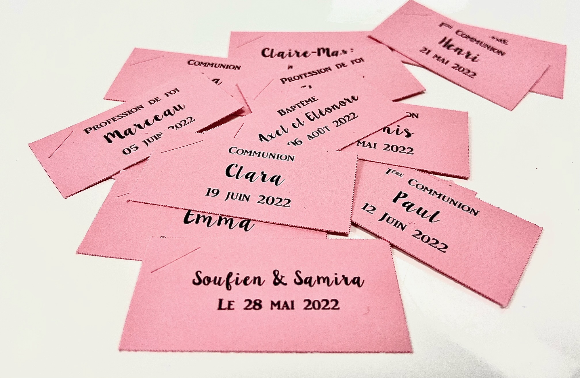 Etiquette rose en forme de rectangle. Cette jolie étiquette personnalisée, dispose d’une fente pour y passer un ruban, afin de pouvoir la fixer à votre contenant à dragées.
