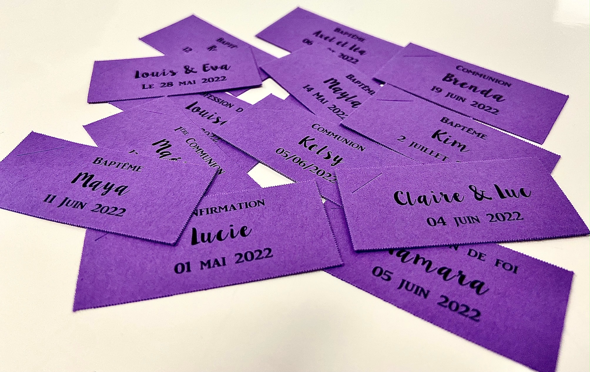 Etiquettes bien faites, une perforation serait mieux pour faire passer le ruban