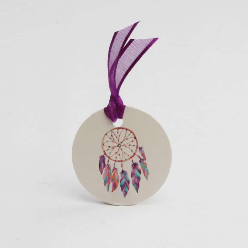 Superbes étiquettes perforées avec imprimés « attrape rêves ». Lot de 4 étiquettes rondes. Vendu sans ruban.
