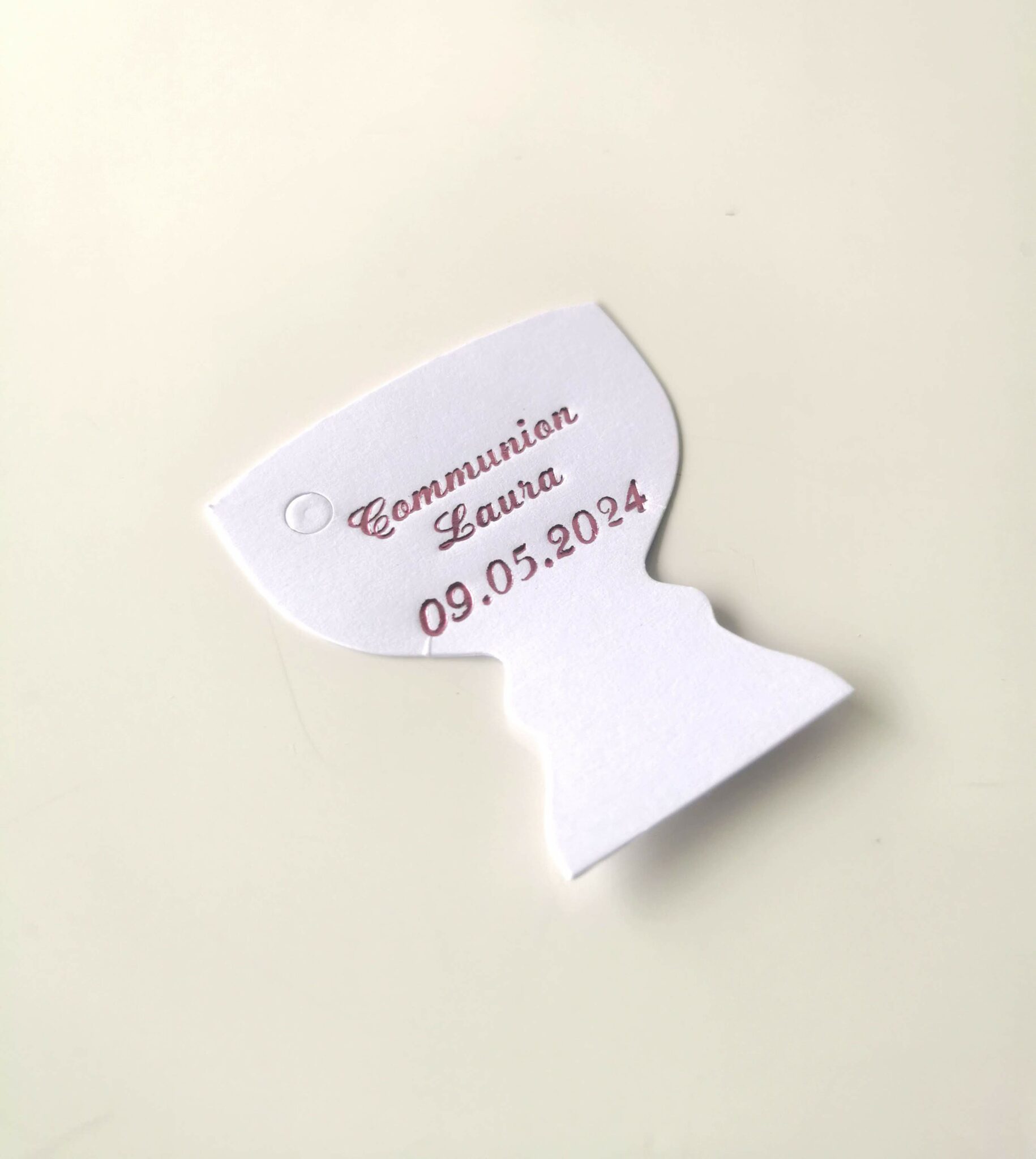 Étiquettes à dragées calice, idéal pour personnaliser vos boites à dragées. Elles sont pourvues d’une perforation afin d’y passer un ruban.
