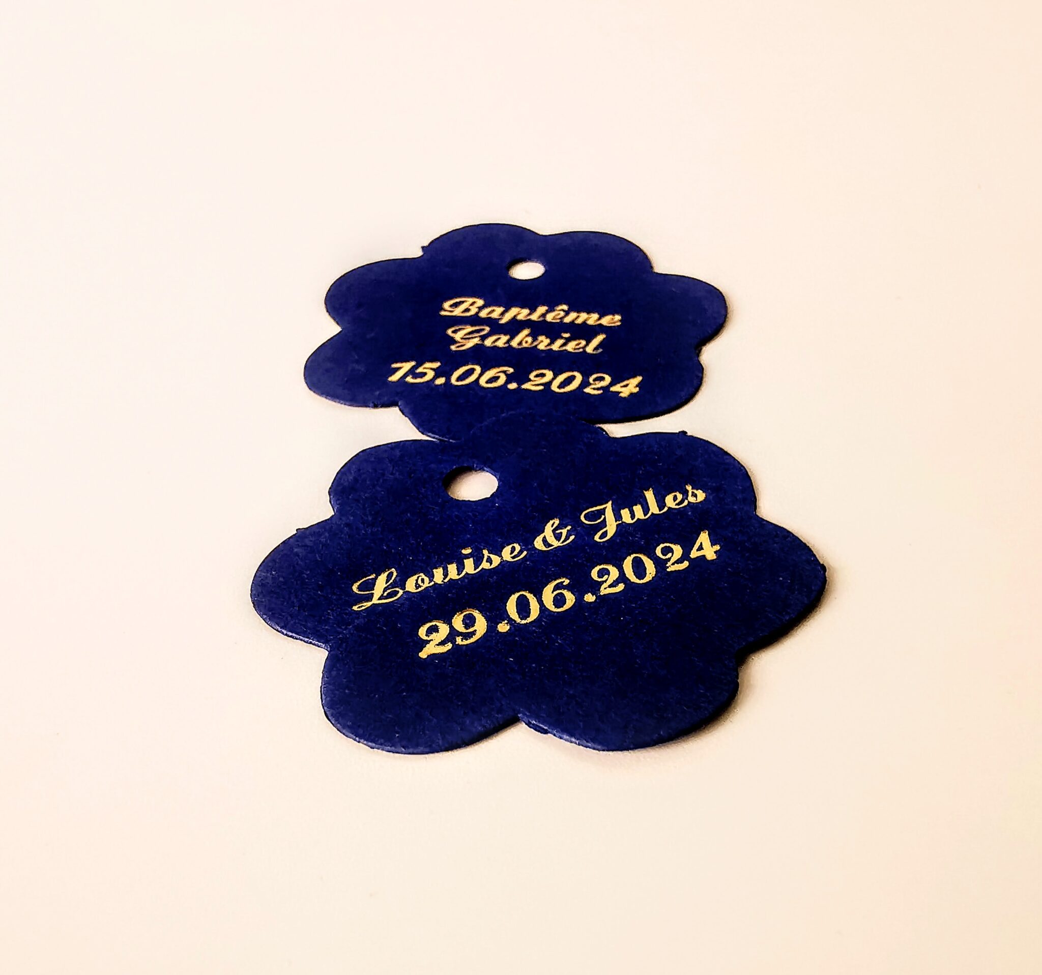 Étiquette dragées fleur, idéal pour personnaliser vos boites à dragées. Elles sont pourvues d’une perforation afin d’y passer un ruban.