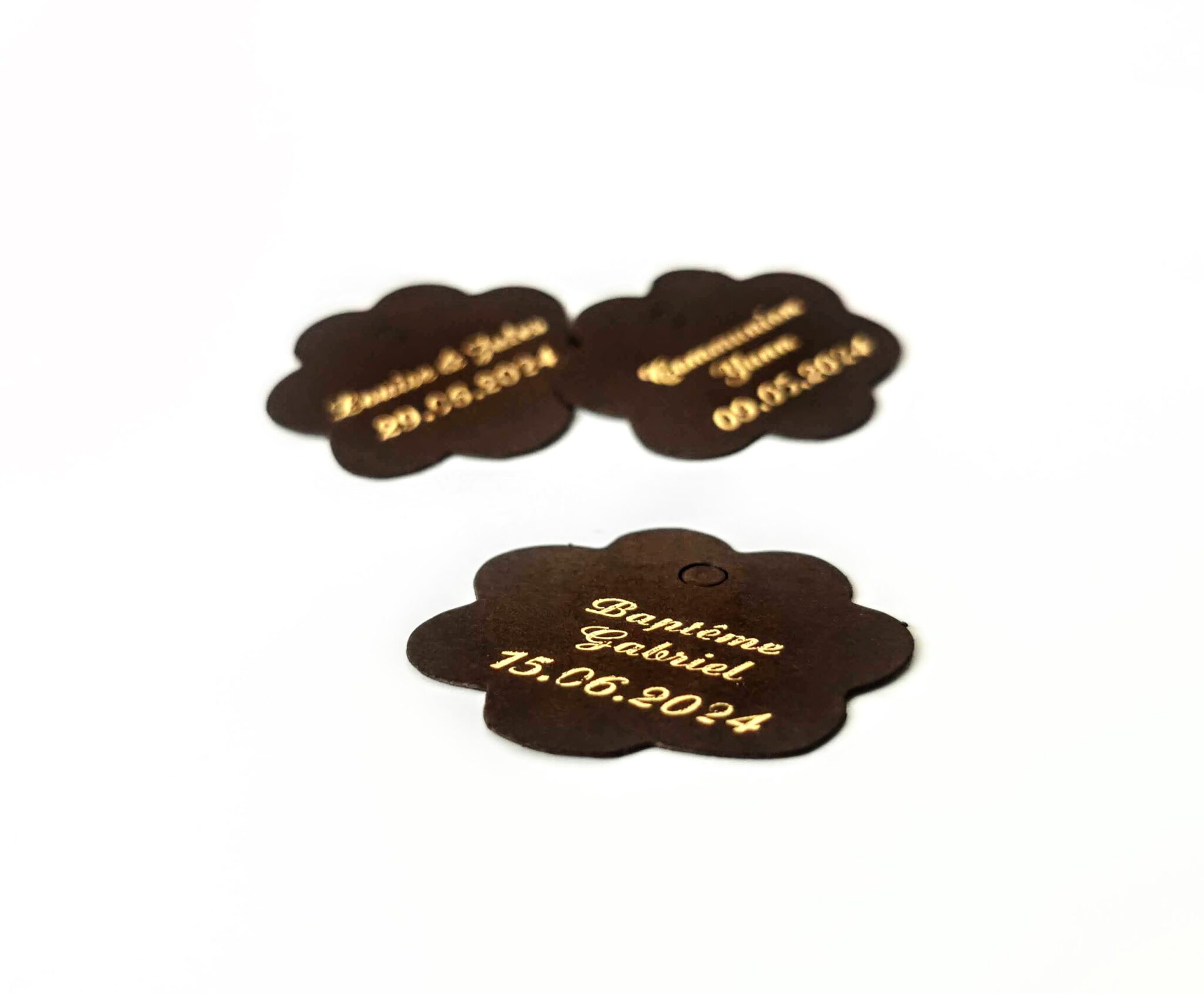 - Dimensions : Avec un diamètre d’environ 4 cm, cette étiquette à dragées est d’une taille idéale pour ajouter une touche spéciale à vos petits cadeaux. Cette étiquette à dragées sera parfaite pour s’adapter à différents types de contenants.