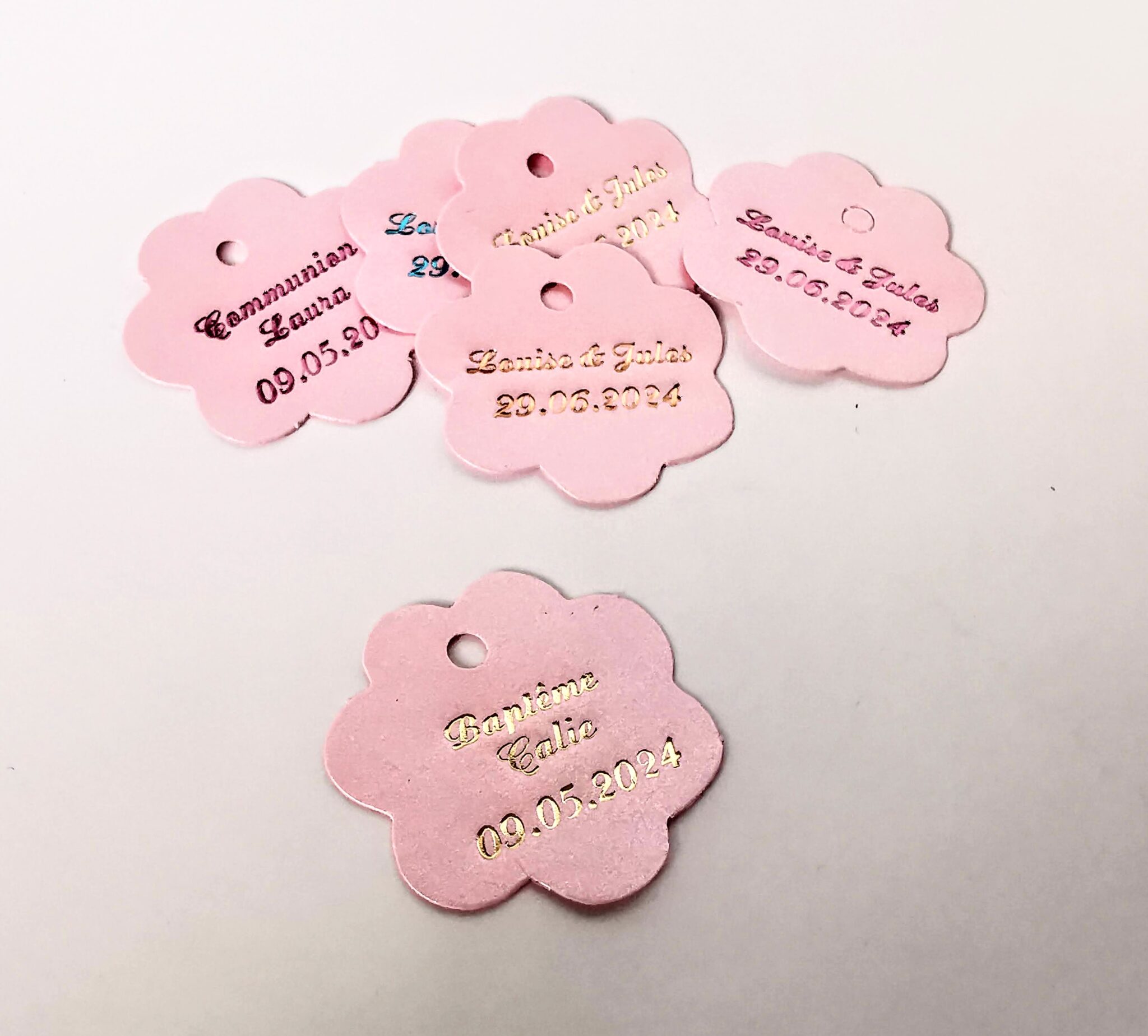 - Dimensions : Avec un diamètre d’environ 4 cm, cette étiquette à dragées est d’une taille idéale pour ajouter une touche spéciale à vos petits cadeaux. Cette étiquette à dragées sera parfaite pour s’adapter à différents types de contenants.
