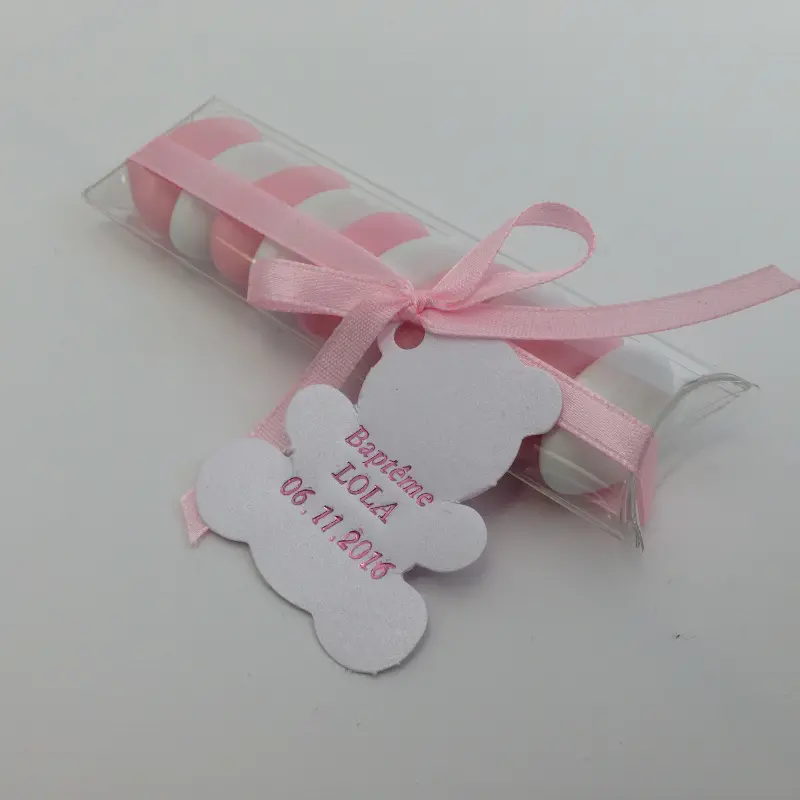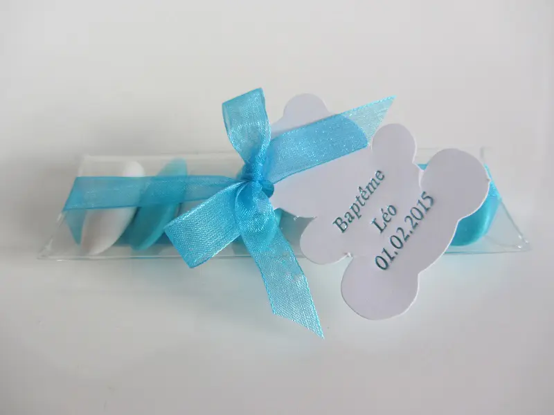 Vous pouvez personnaliser ce contenant à dragées transparent avec une étiquette calice ou une étiquette ourson et un ruban organza.