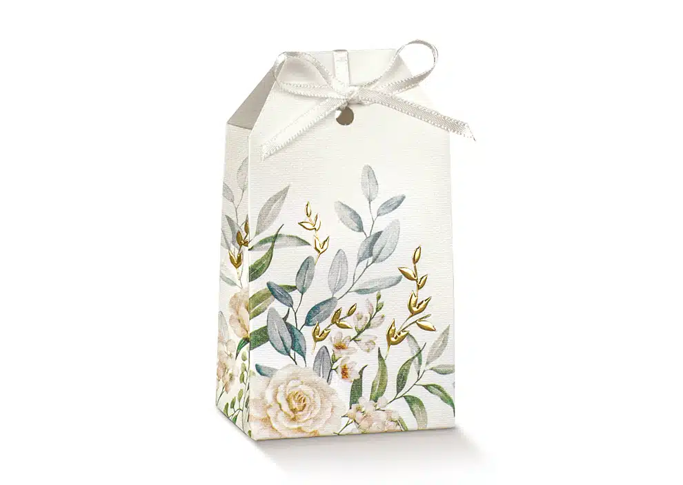 Laissez-vous séduire par cette élégante boîte à dragées en format étui, décorée d’un délicat motif de feuillage vert agrémenté de fines touches dorées. Fabriquée en carton blanc texturé de qualité, elle évoque la nature, la fraîcheur et la sérénité, pour une ambiance chic et végétale.