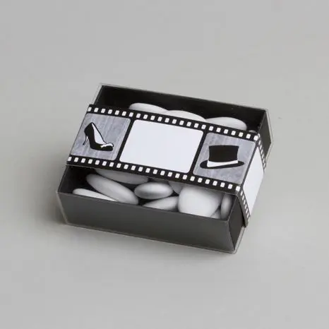 Un mariage réussi et original avec ce contenant dragées thème cinéma. Fournie avec le bandeau motif cinéma sur lequel vous pourrez inscrire les prénoms des mariés ou le prénom de chaque invité afin de marquer leur place…