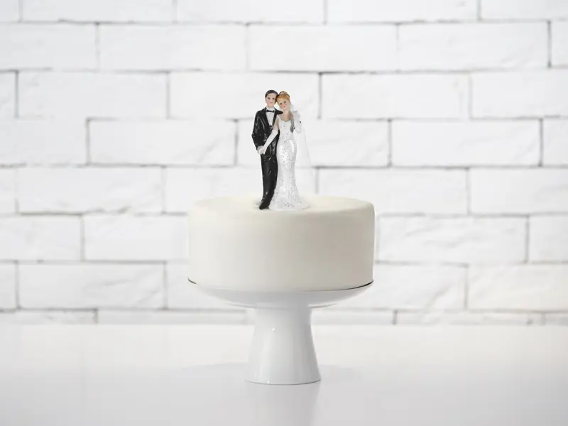 Très belle figurine de mariage , représentant un couple de mariés en noir et blanc se tenant la main, entouré d’un cœur à roses rouges. Cette figurine est idéale pour votre pièce montée, mais peut également décorer votre table, ou être posée sur votre urne.