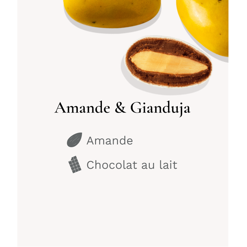 L’alliance surprenante du croustillant et du moelleux – Amande grillée et Gianduja (chocolat au lait et pâte de noisette) – Finition au sucre fin façon galet.