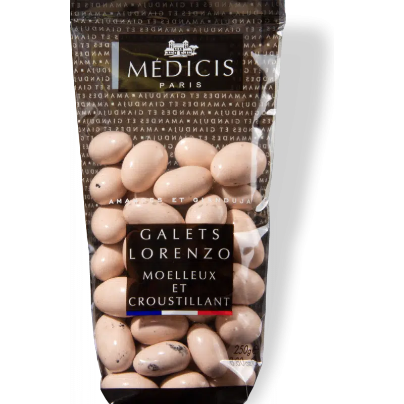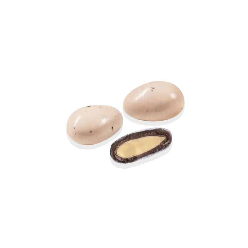 Dragees galet Lorenzo pêche/corail. L’alliance surprenante du croustillant et du moelleux – Amande grillée et Gianduja (chocolat au lait et pâte de noisette) – Finition au sucre fin façon galet. Vendu par sachet de 250 gr, soit environ 40 dragées.