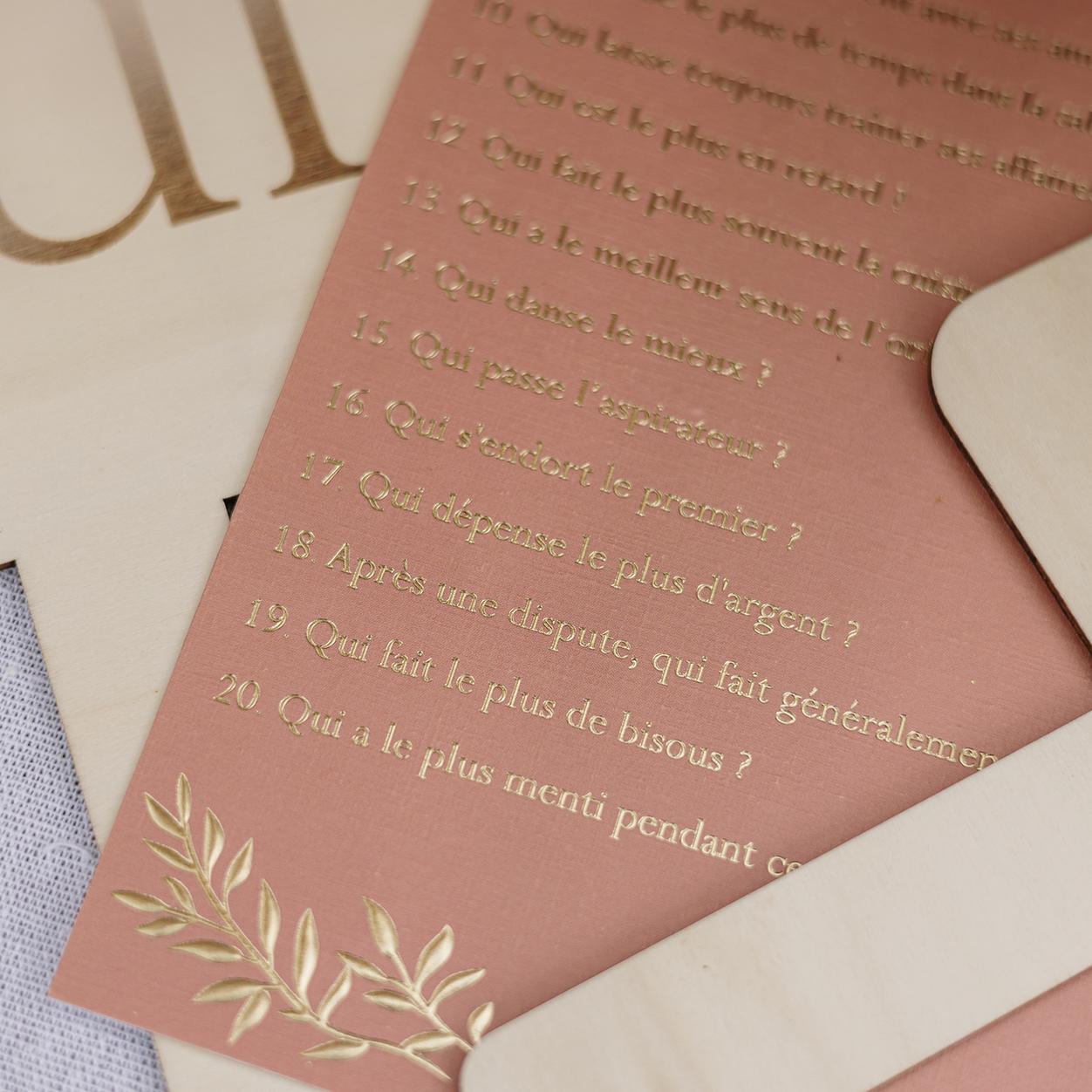 - Une carte de 20 questions, imprimée sur un élégant papier terracotta avec des inscriptions dorées.