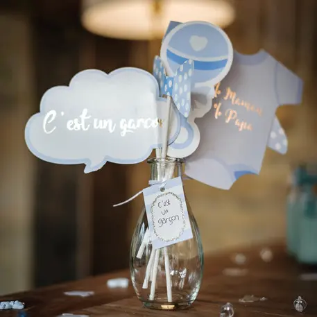 Trop sympa, ce kit de 11 accessoires photobooth Baby Shower bleu comprenant biberon, nœud papillon, tétine, jouets aux couleurs pastels et tendres… Vraiment trop amusant pour réaliser des photos rigolotes lors de votre Baby Shower. Ces accessoires photobooth Baby Shower bleu permettront à vos invités de réaliser des séries de photos plus délirantes les unes que les autres en vous laissant toute une série de jolis souvenirs et de bonne humeur ! Ambiance et rigolade garanties !