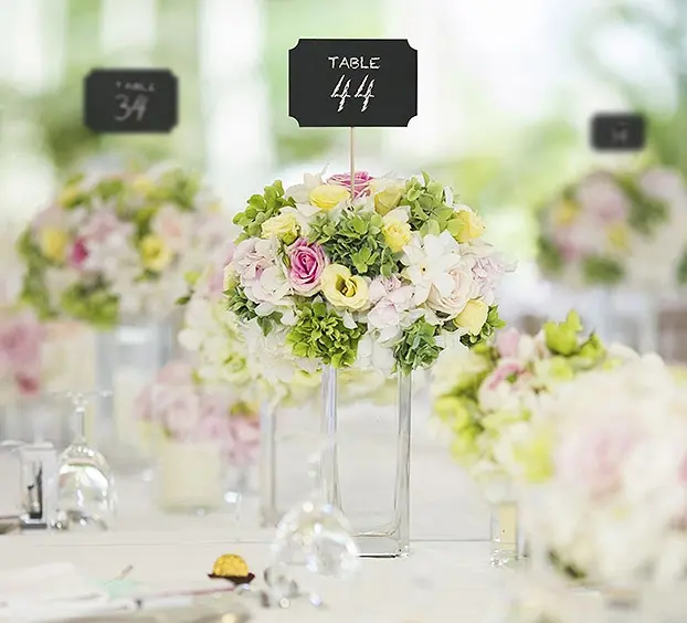 Vendu par sachet de 4 marque-tables, personnalisables avec craie ou stylo blanc.