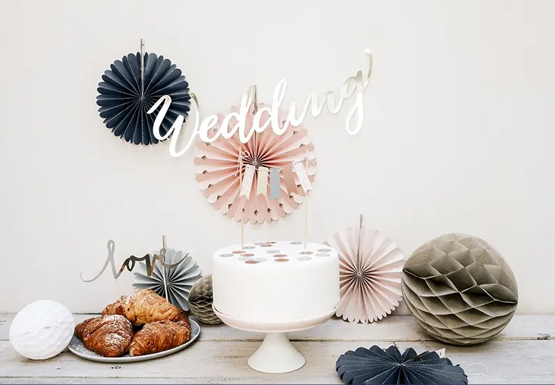 Ce pic scintillant aux couleurs pastel présenté sous forme de petite banderole de fanions, donnera une touche d’élégance à votre pièce montée, lors de votre mariage. N’hésitez pas à compléter votre décoration de table et de salle avec les accessoires que nous vous proposons.