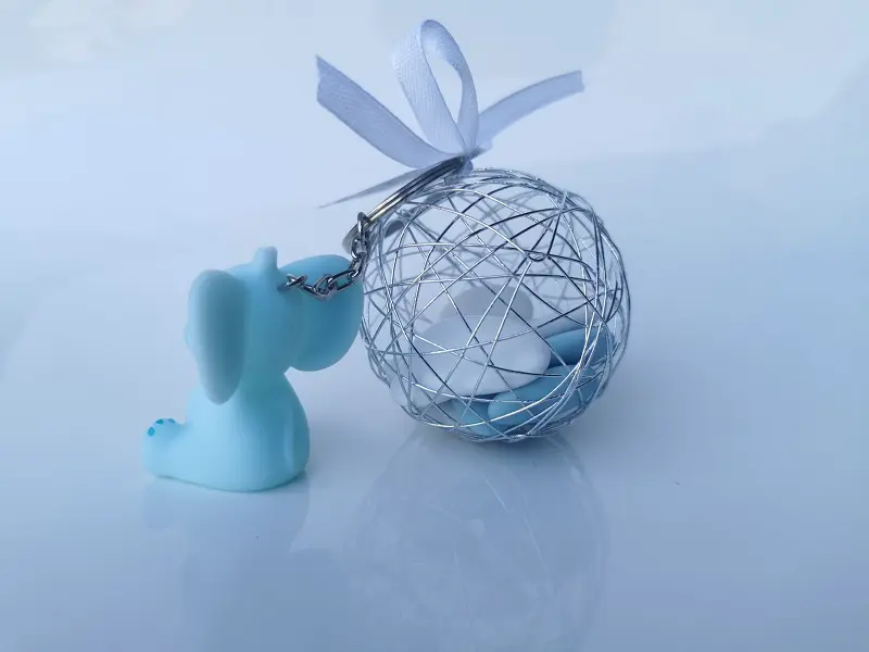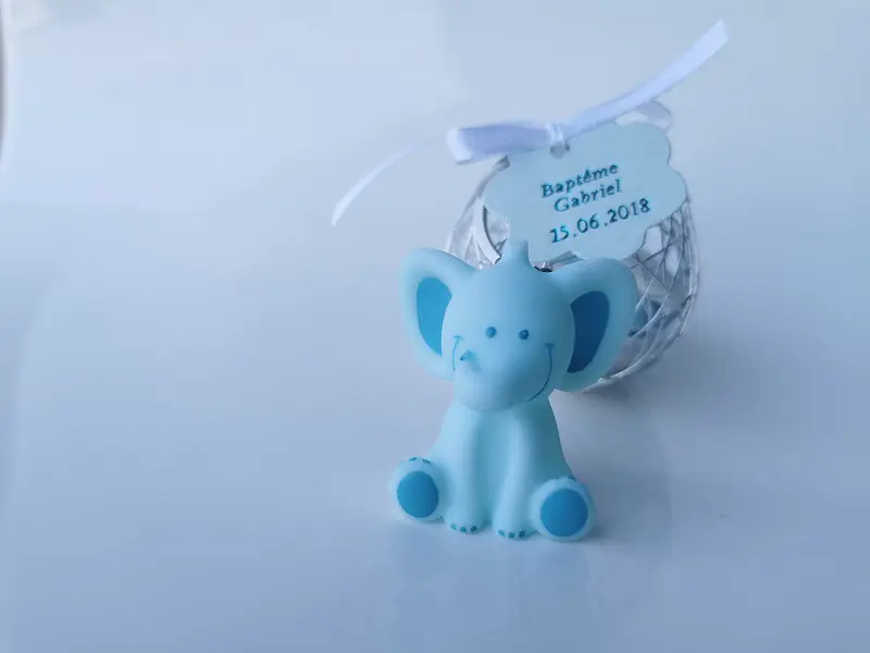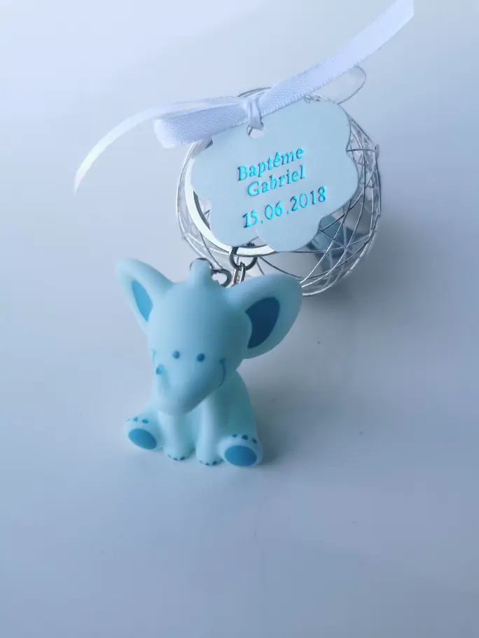 Pour le baptême ou la naissance de votre garçon offrez ce superbe porte clés éléphant, pour un cadeau d’invité vraiment original! Vendu seul.