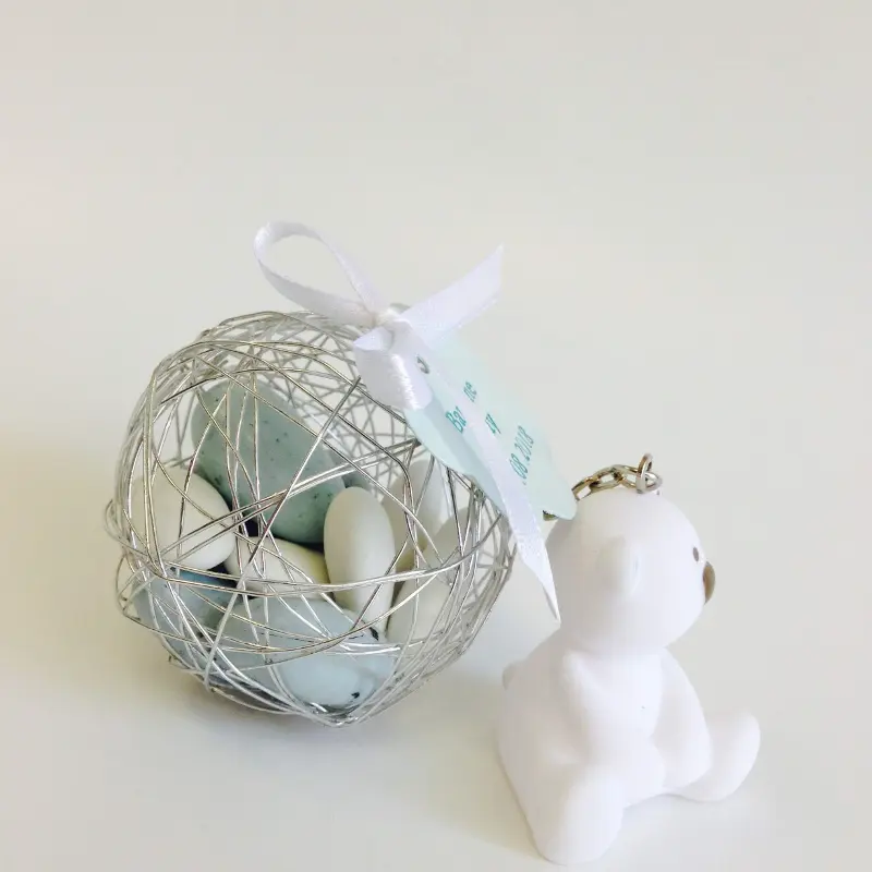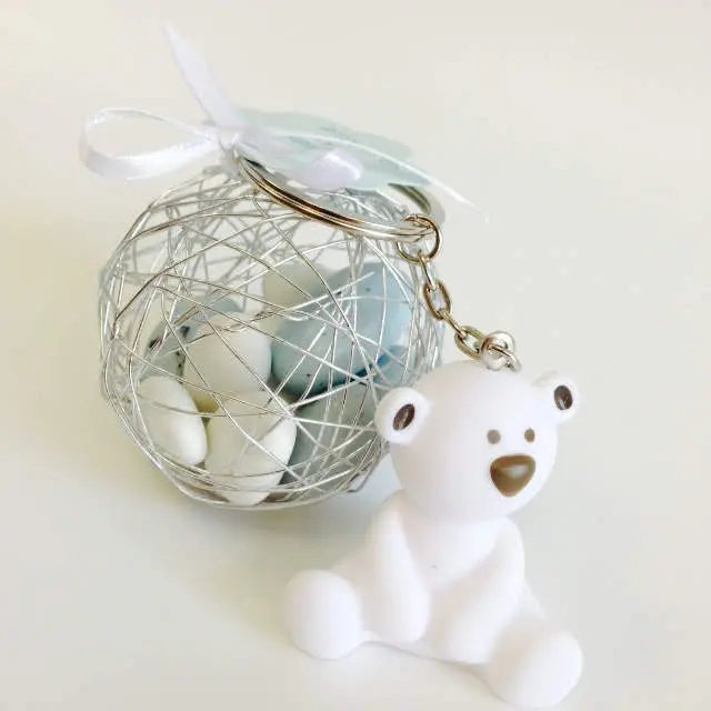 Vous pouvez agrémenter ce porte clés avec une boule en métal argenté (5 à 6 cm de diamètre) non fourni avec le porte clés ourson. Pour parfaire votre contenant à dragées original, suivez nos conseils :