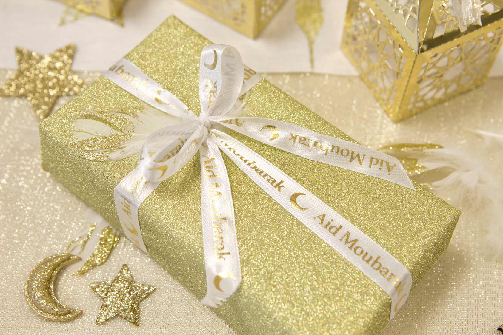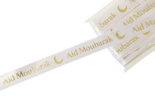Ruban « Aid Moubarak » avec motif lune en satin, indispensable pour vos contenants à dragées. Son aspect brillant et son toucher soyeux relèvent le caractère doux et raffiné de vos contenants à dragées. Complétez à merveille votre vaisselle jetable et obtenez une décoration harmonieuse lors de la fête de l’Aïd. Découvrez toute la collection Eid Moubarak blanc et or.