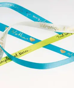 Une alternative originale aux étiquettes à dragées pour vos contenants, vos menus, vos ronds de serviette… Personnalisez vos rubans avec prénom(s) et la date de l’événement. Qu’il s’agisse d’un mariage, d’un baptême, d’une communion, d’un anniversaire… le ruban personnalisé sera être un atout pour un souvenir inoubliable !