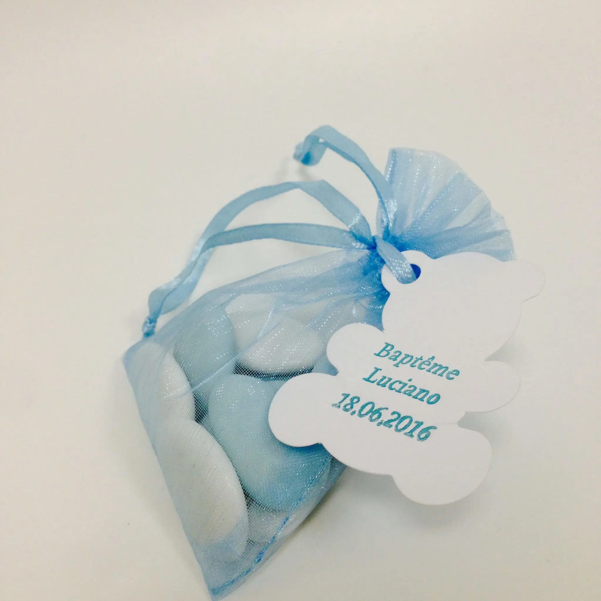 Vous pouvez ajouter une étiquette personnalisable ou des dragées personnalisées à vos sacs à dragées.