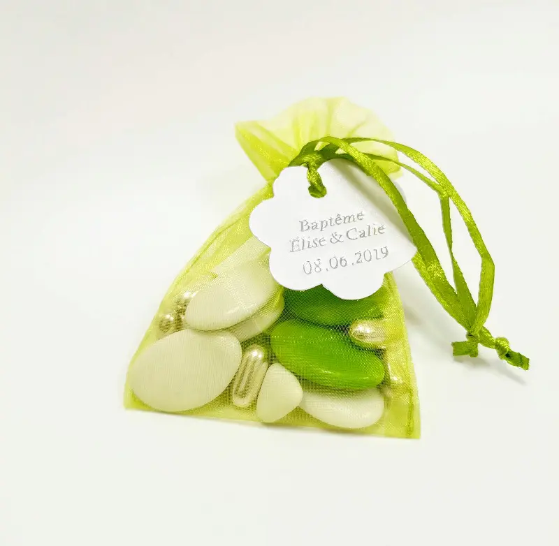 Vous pouvez ajouter une étiquette personnalisable ou des dragées personnalisées à vos sacs à dragées
