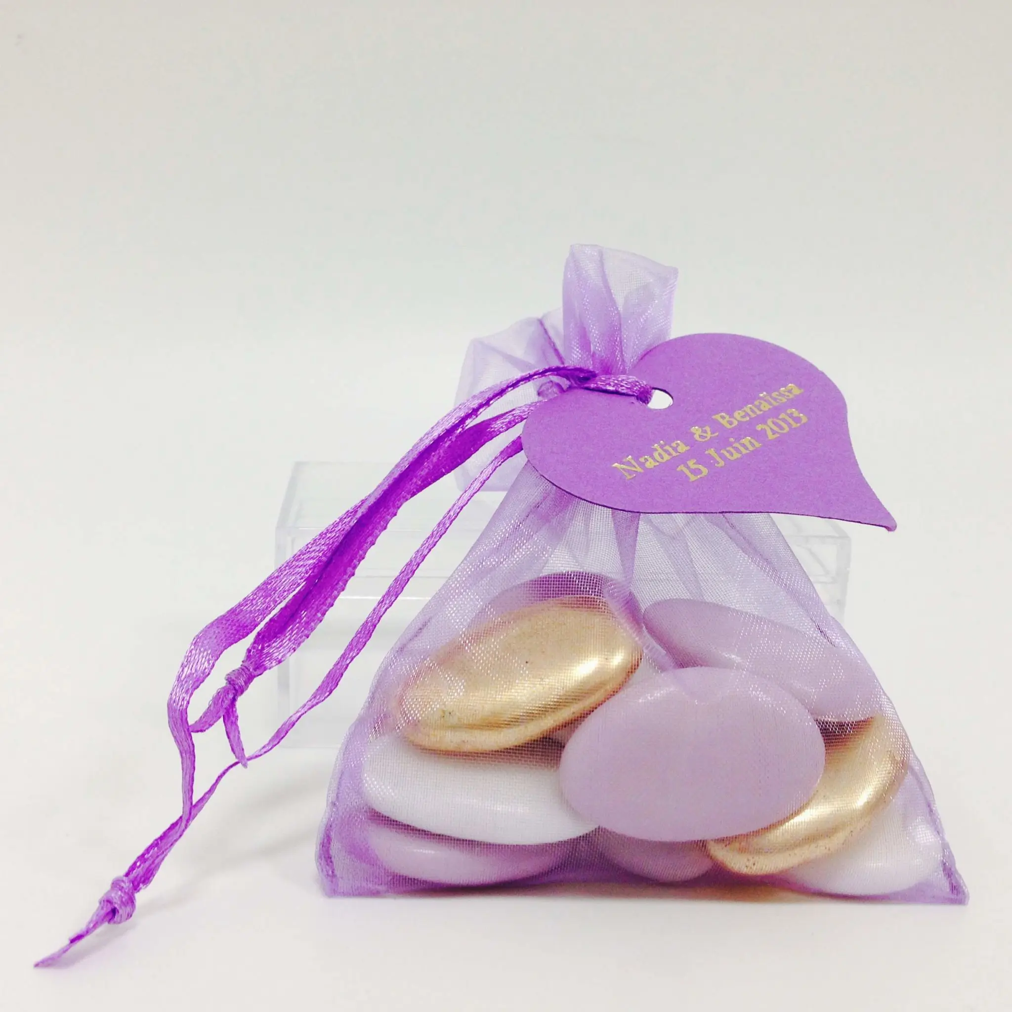 Vous pouvez ajouter une étiquette personnalisable ou des dragées personnalisées à vos sacs à dragées.
