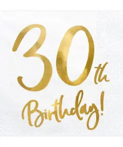 Serviettes Anniversaire »30th Birthday » – Blanc/Or – Lot de 20