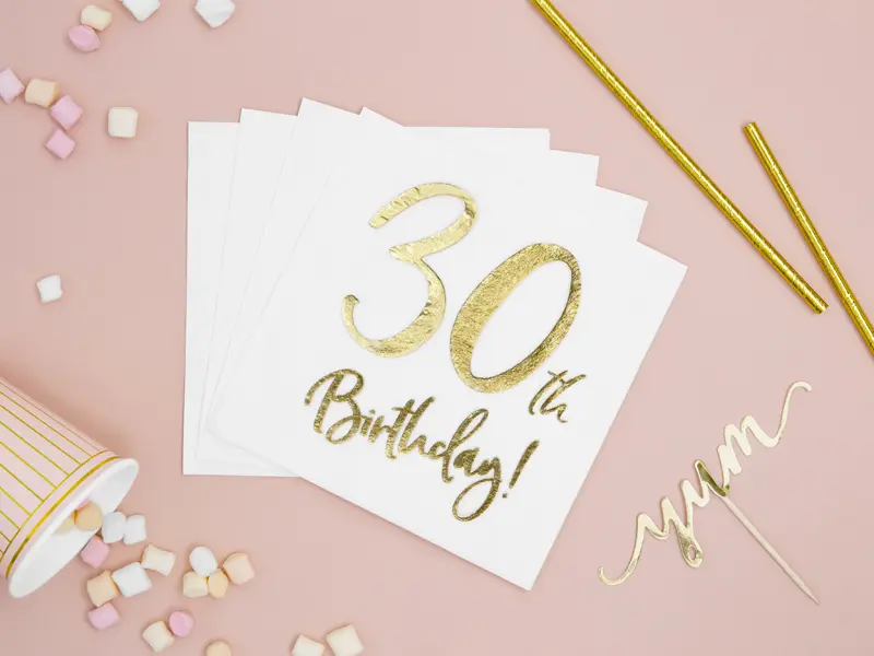 Serviettes Anniversaire »30th Birthday » – Blanc/Or – Lot de 20