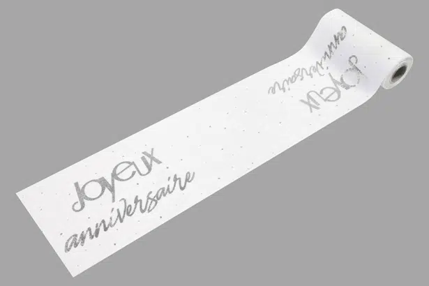 Lors de votre fête, décorez votre table avec ce sur chemin « Joyeux anniversaire » sur thème blanc et Argent.