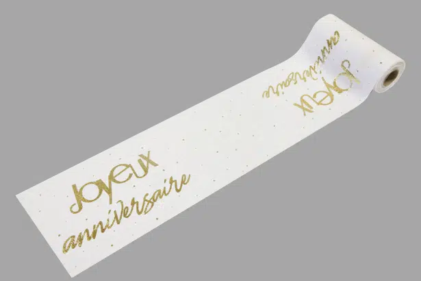 Lors de votre fête, décorez votre table avec ce sur chemin « Joyeux anniversaire » sur thème blanc et Or.