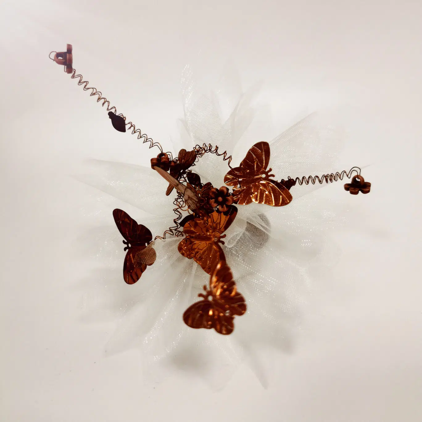 Magnifique bouquet sur tige de papillons et petites fleurs. Le bouquet mesure environ 12 cm de hauteur (sans la tige qui est à insérer au centre). Le « bouquet » est composé de 4 tiges ( 2 tiges : avec 4 papillons sur chacune des tiges et 2 autres tiges : avec deux fleurs et deux feuilles sur chacune de ces 2 tiges)