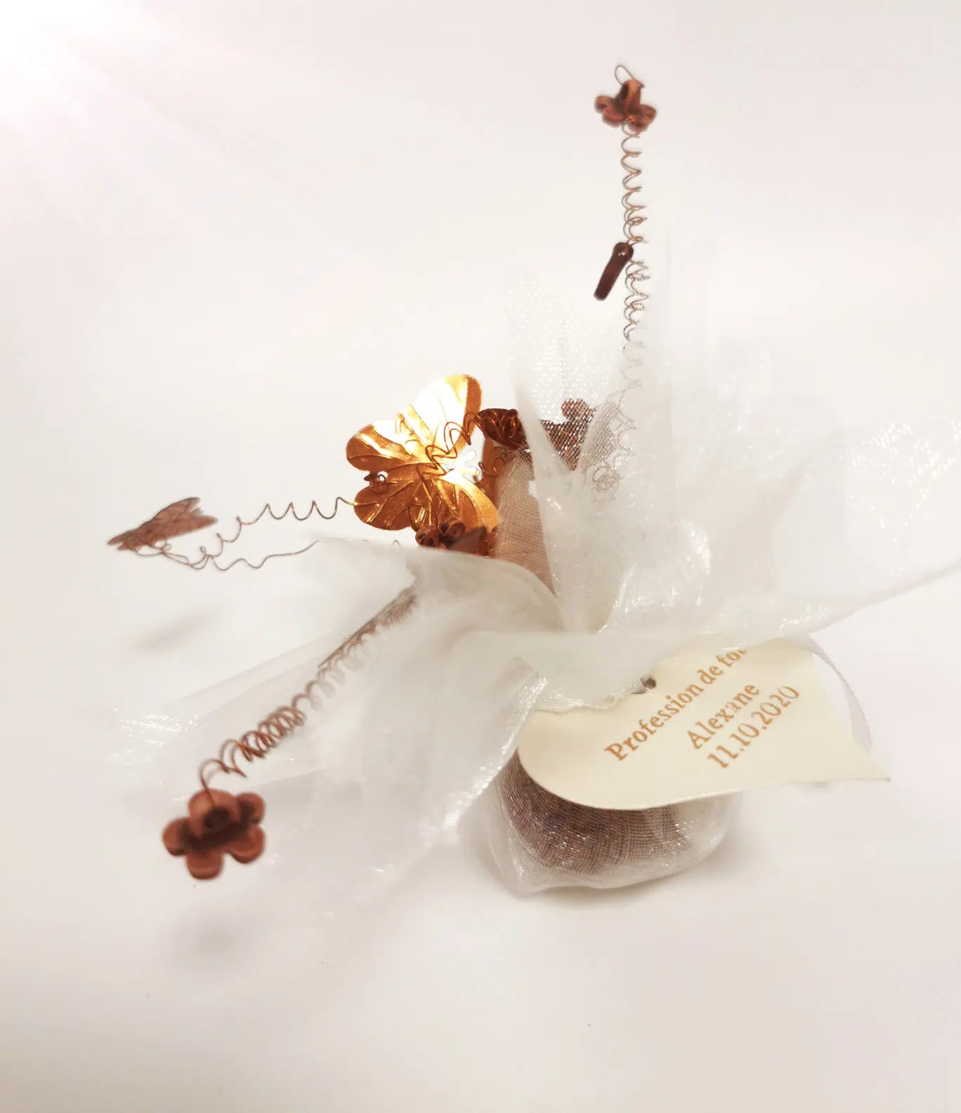 Vous pouvez placer ce bouquet au cœur de 2 tulles cristal . Le tout joliment noué par un ruban satin . Le prix de cette décoration de mariage, de baptême ou de communion comprend uniquement le bouquet. Les tulles, le ruban et les dragées sont vendu séparément.