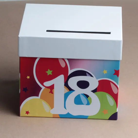 Illustration ballons et annotation « 18 » sur fond coloré, avec couvercle blanc, présentant une fente pour y glisser les enveloppes. Pour une décoration lors de votre dix-huitième anniversaire.