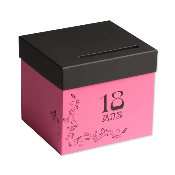 Décor fleurs et papillons, annotation « 18 ans » sur fond rose fuchsia, avec couvercle noir, présentant une fente pour y glisser les enveloppes. Pour une décoration lors de votre dix-huitième anniversaire.