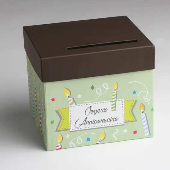 Illustration ,bougies, confettis, et annotation « Joyeux Anniversaire »sur fond vert pâle, avec couvercle marron, présentant une fente pour y glisser les enveloppes. Pour une décoration lors de votre anniversaire.