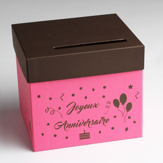 Illustration confettis, ballons et annotation « Joyeux Anniversaire »sur fond rose fuchsia, avec couvercle marron, présentant une fente pour y glisser les enveloppes. Pour une décoration lors de votre anniversaire.