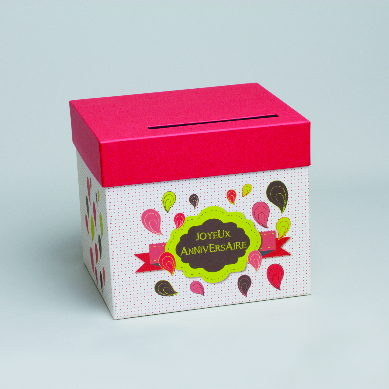 Tirelire cartonnée, illustration colorée « joyeux anniversaire », avec couvercle rouge, présentant une fente pour y glisser les enveloppes. Pour une décoration lors de votre anniversaire.