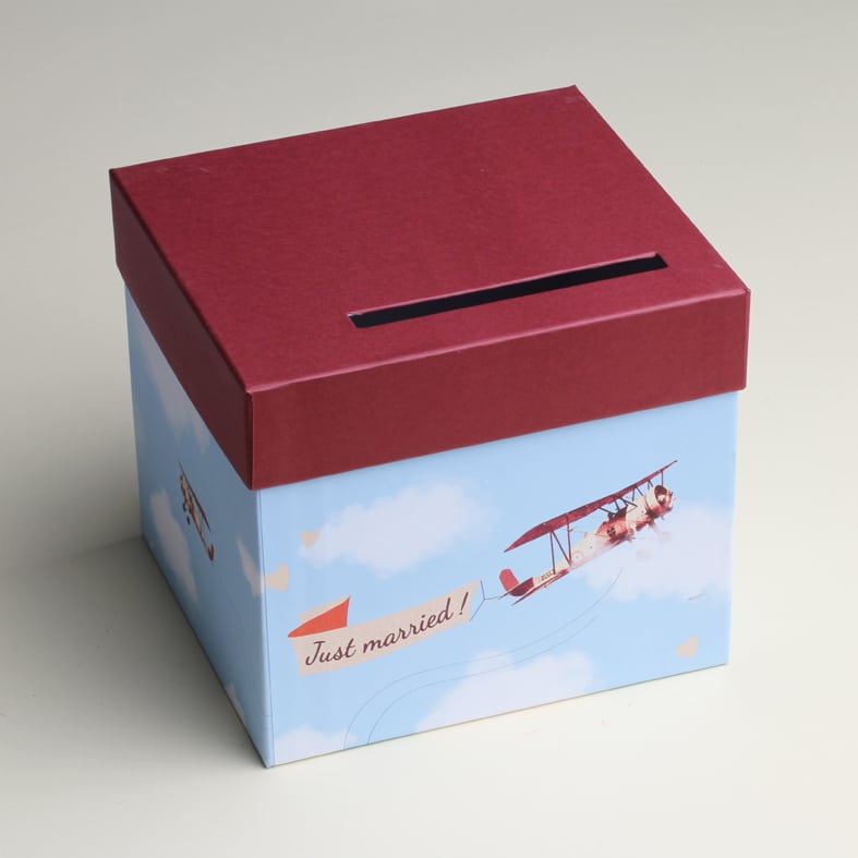 Tirelire cartonnée, illustration avion « Just married », avec couvercle bordeaux présentant une fente pour y glisser les enveloppes. Une belle décoration sur le thème du voyage pour votre mariage!