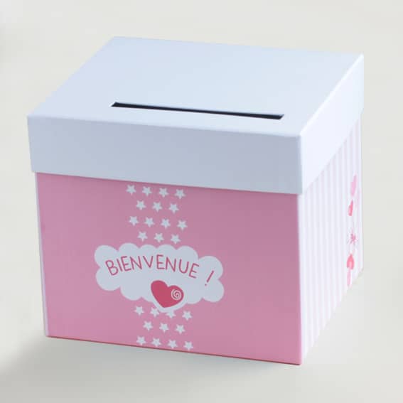 Annotation « Bienvenue » dans un nuage blanc sur fond rose étoilé, avec couvercle blanc, présentant une fente pour y glisser les enveloppes. Pour une décoration lors de la baby shower.