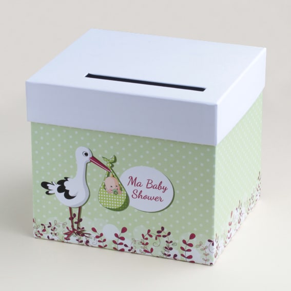 Illustration cigogne portant un bébé dans un baluchon sur fond vert pâle à petits pois blancs , avec couvercle blanc, présentant une fente pour y glisser les enveloppes. Pour une décoration lors de la baby shower.