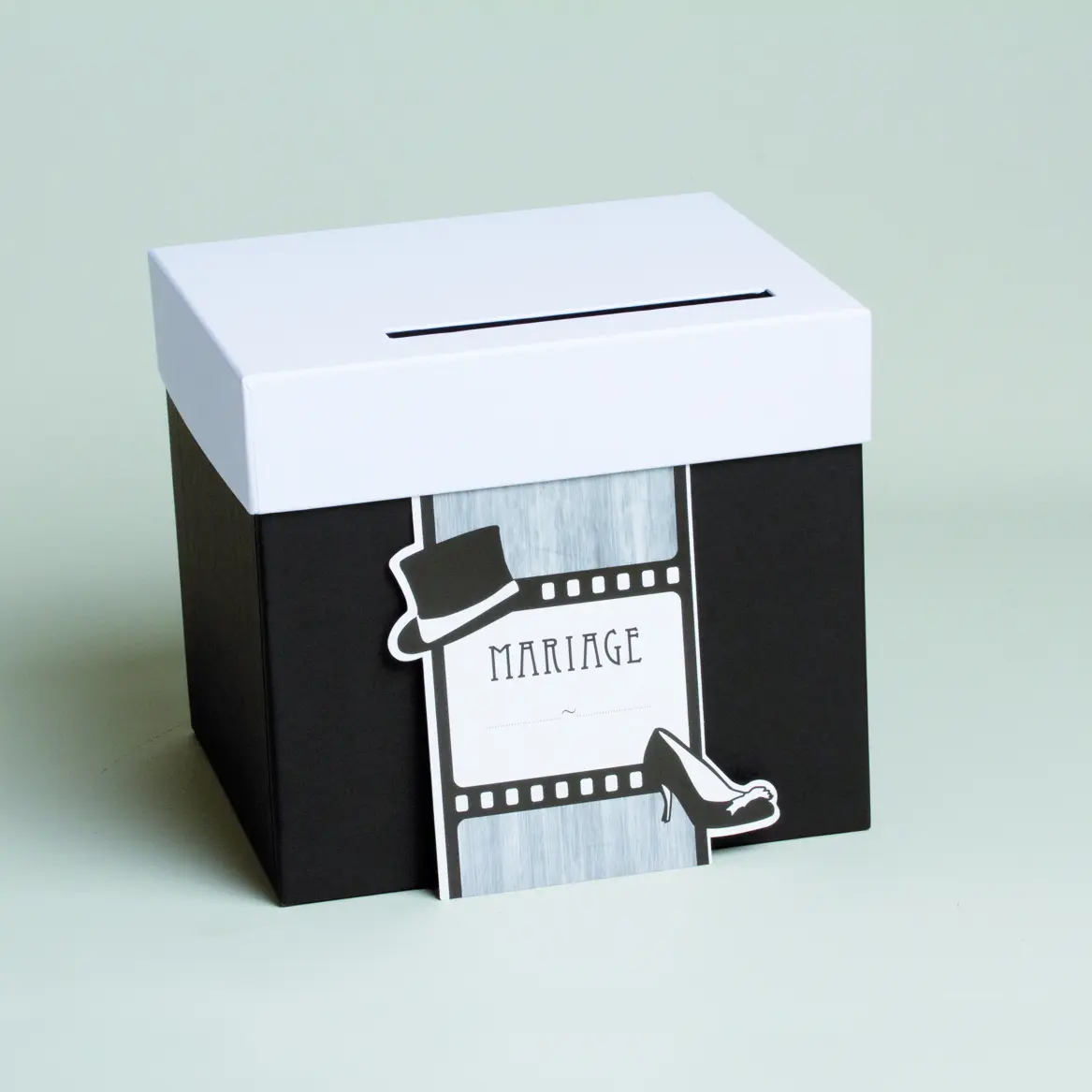 Tirelire cartonnée, illustration en noir et blanc sur le thème du cinéma, avec couvercle blanc, présentant une fente pour y glisser les enveloppes. Pour une décoration lors de votre mariage.
