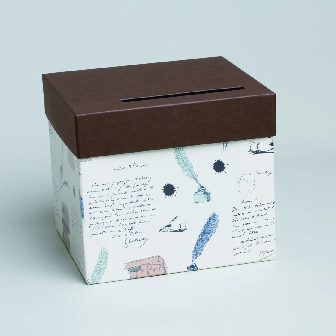 Tirelire cartonnée, illustration sur le thème de l’écriture, avec couvercle marron présentant une fente pour y glisser les enveloppes. Une belle décoration pour votre mariage, votre anniversaire…