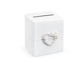 Magnifique urne rigide en papier nacré blanc pour votre mariage! Sur l’avant, un cœur de petites fleurs ivoire entouré d’une ficelle en lin décore élégamment l’urne. Une fente sur le haut permet de recueillir de nombreuses enveloppes.Vous pouvez idéalement associer cette urne à votre décoration de salle.
