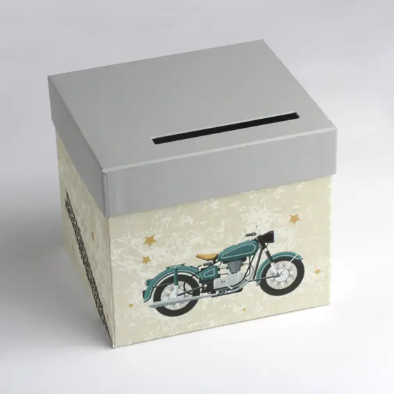 Tirelire cartonnée, illustration moto, avec couvercle gris, présentant une fente pour y glisser les enveloppes. Pour une décoration sur le thème de la moto.
