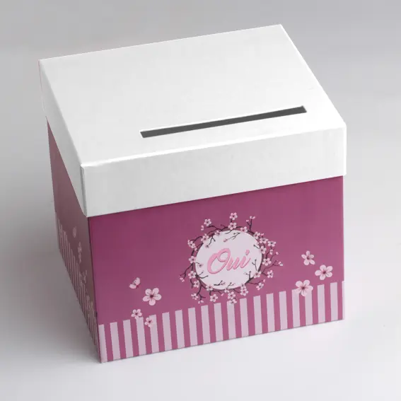 Tirelire cartonnée, illustration sur fond rose, avec fleurs et impression du mot « oui », avec couvercle blanc, présentant une fente pour y glisser les enveloppes. Pour une décoration lors de votre mariage.