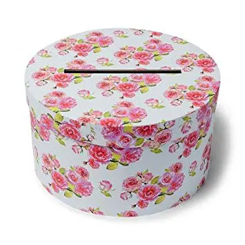 Tirelire cartonnée. Magnifique urne ronde fleurie , illustrée de roses, avec couvercle présentant une fente pouvant accueillir de nombreuses enveloppes à l’occasion de votre mariage, d’une communion…
